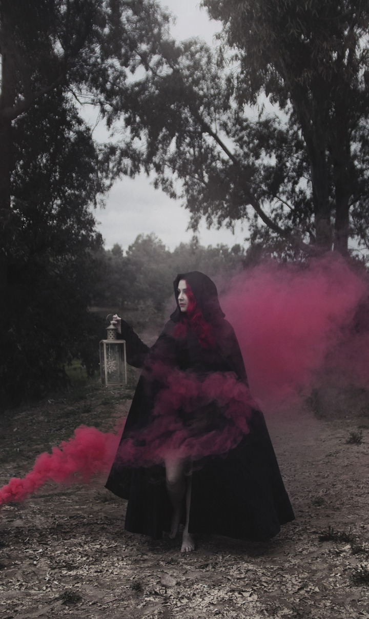 девушка, дым, фонари, плащ
