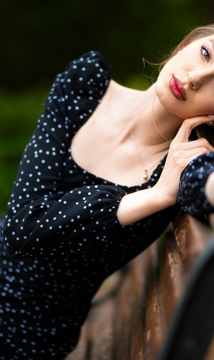 взгляд, девушка, лицо, поза, руки, платье, скамья, красная помада