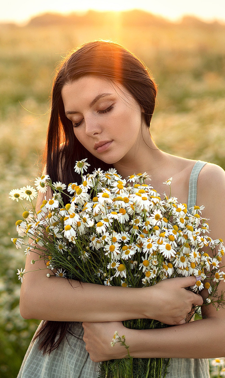 Назад к обои лето, девушка, цветы, поза, настроение, ромашки, букет, луг