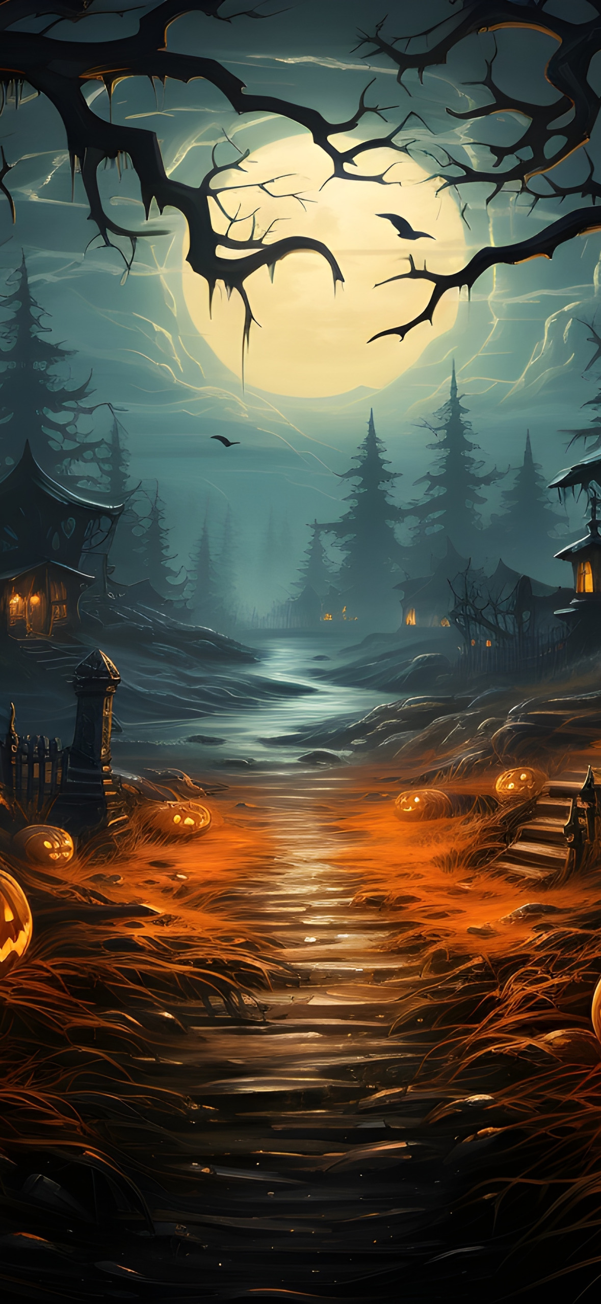 Назад к обои деревья, ночь, луна, дома, Halloween, тыква, летучие мыши, хэллоуин