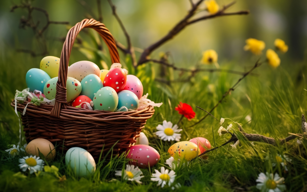 Назад к обои цветы, корзина, поляна, яйца, весна, colorful, Пасха, flowers