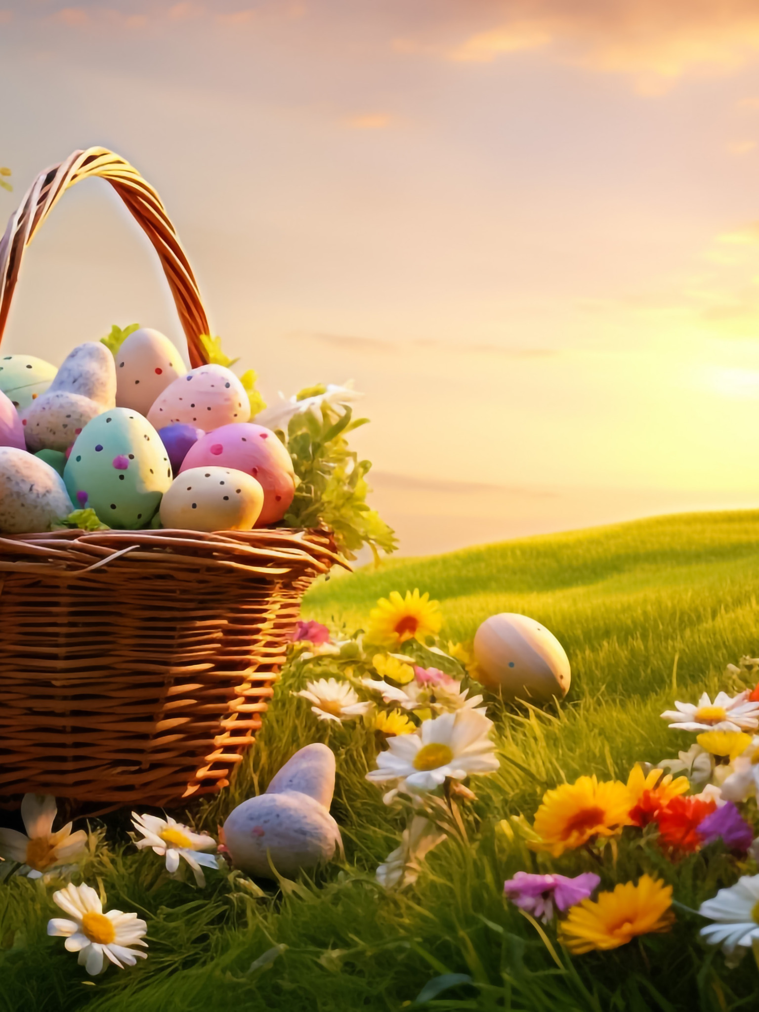 Назад к обои цветы, корзина, поляна, яйца, весна, colorful, Пасха, flowers