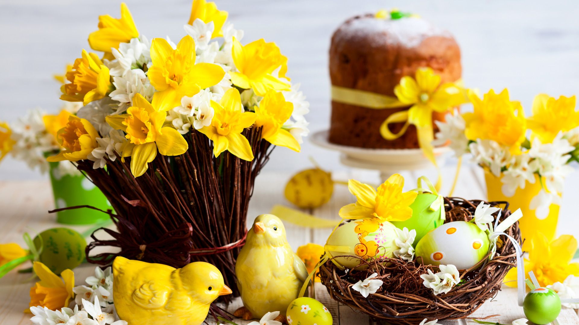 Назад к обои цветы, яйца, весна, Пасха, статуэтка, выпечка, нарциссы, spring