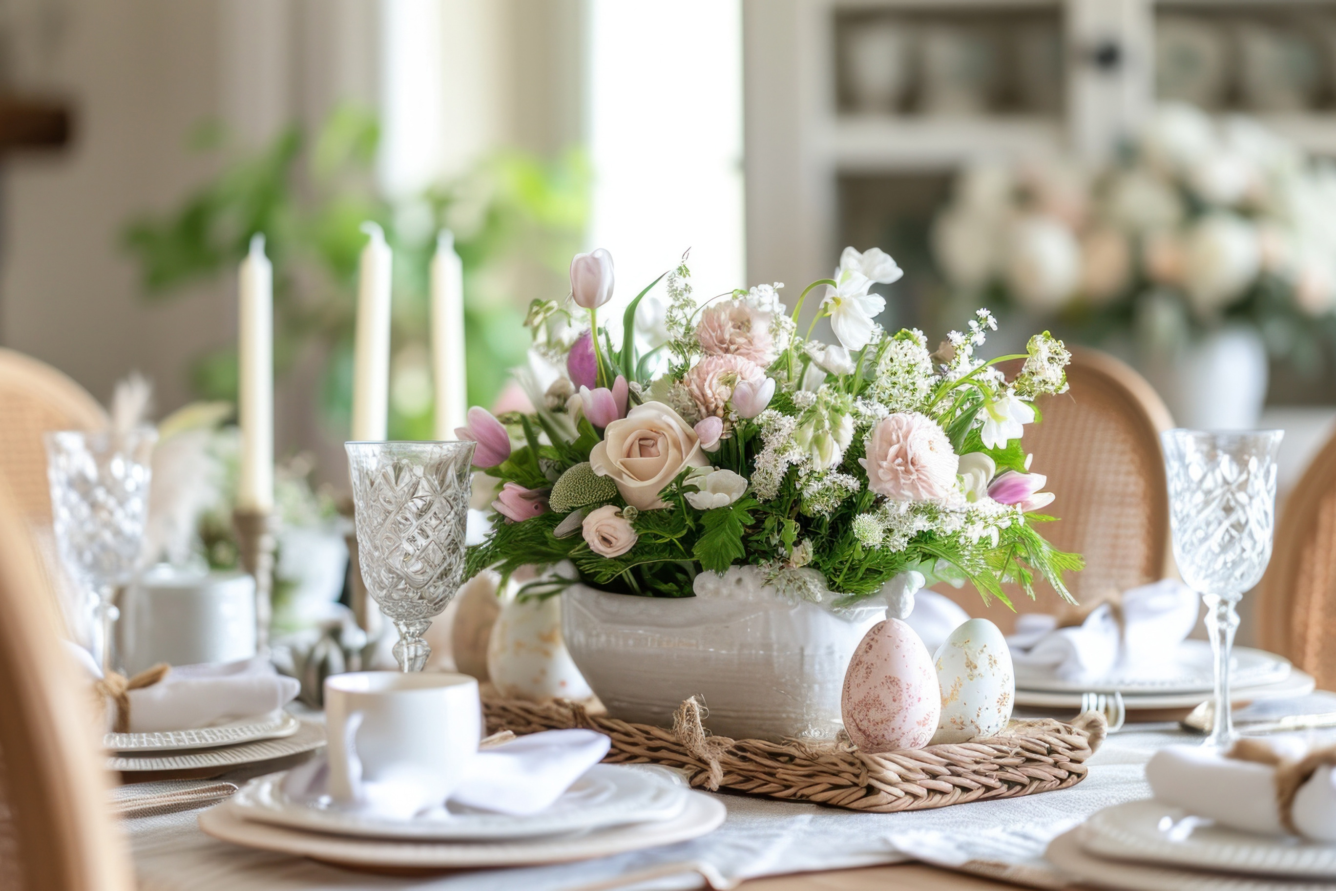 цветы, стол, яйца, букет, свечи, Пасха, посуда, застолье