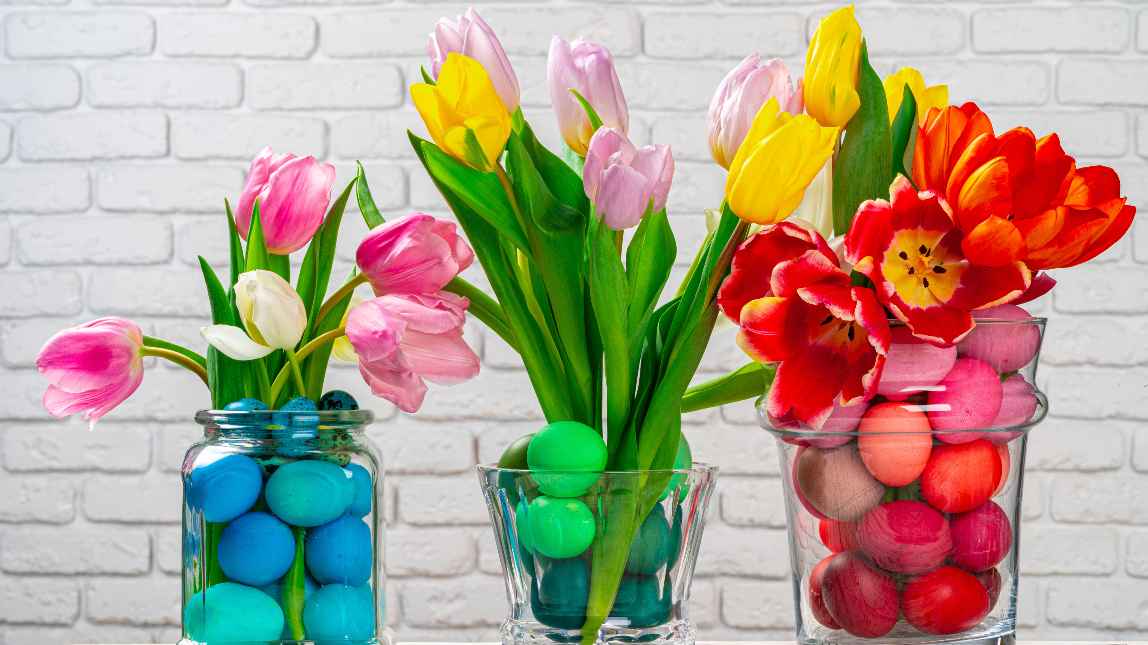 Назад к обои цветы, яйца, весна, colorful, Пасха, тюльпаны, pink, flowers
