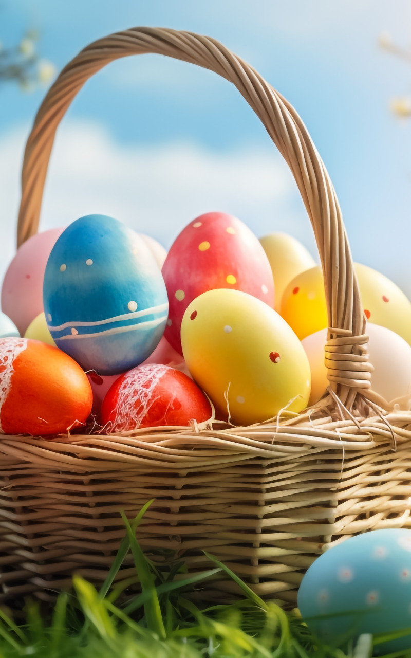 Назад к обои цветы, корзина, поляна, яйца, весна, colorful, Пасха, flowers