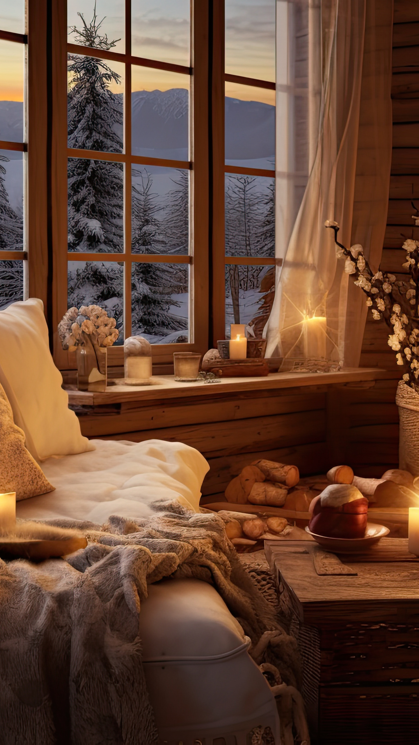 Назад к обои зима, снег, огни, уют, комната, диван, вечер, свечи