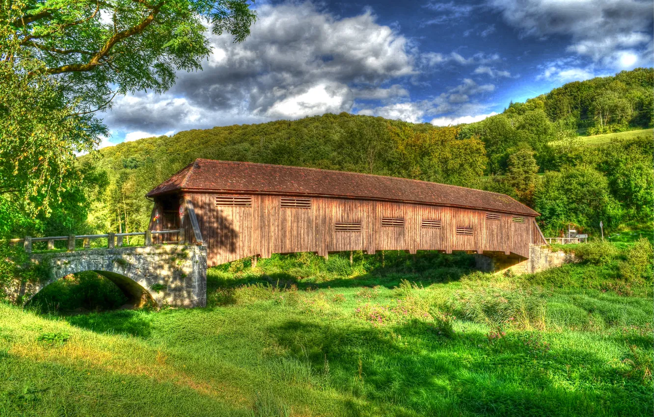 Небо, трава, облака, деревья, горы, мост, галерея обои на телефон (фото, картинки)
