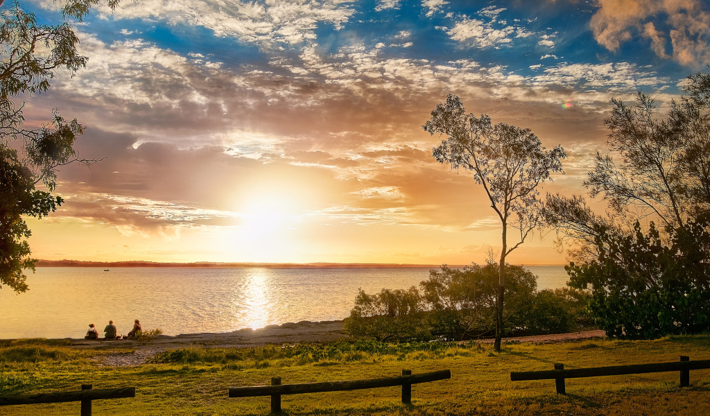 Назад к обои небо, солнце, облака, свет, деревья, ветки, берег, человек