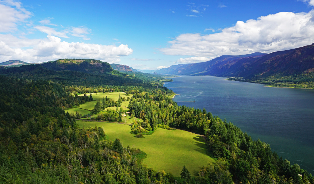 зелень, лес, небо, солнце, облака, деревья, горы, река