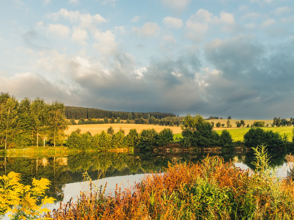 Назад к обои поле, осень, лес, небо, облака, деревья, отражение, река