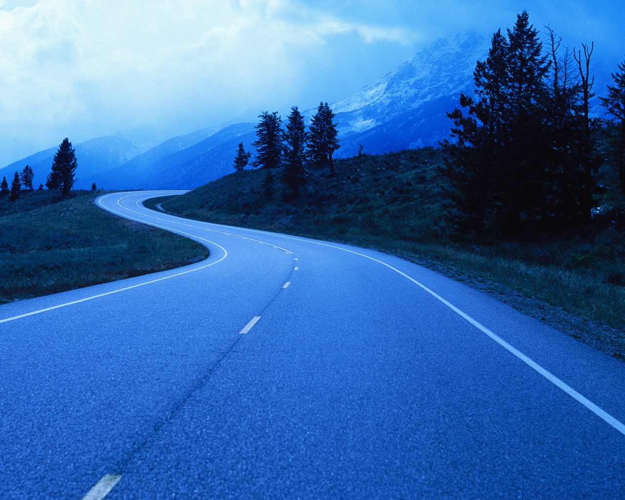 Назад к обои дорога, облака, деревья, горы, разметка, елка, сумерки