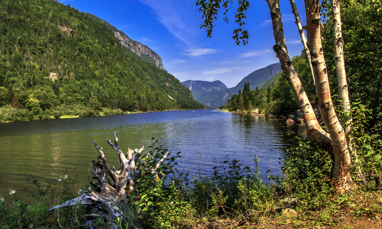 лес, трава, деревья, горы, река, камни, берег, Канада