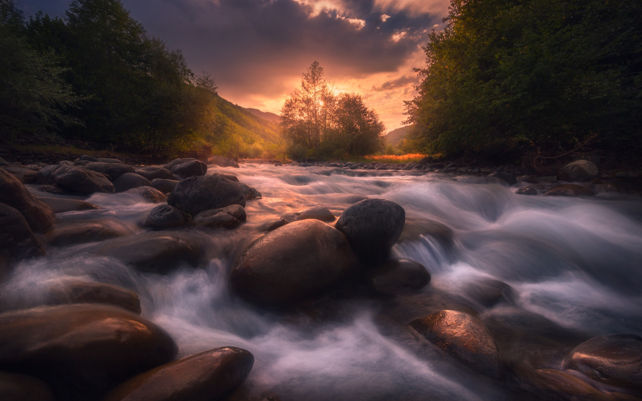 Назад к обои небо, деревья, пейзаж, закат, тучи, природа, река, камни