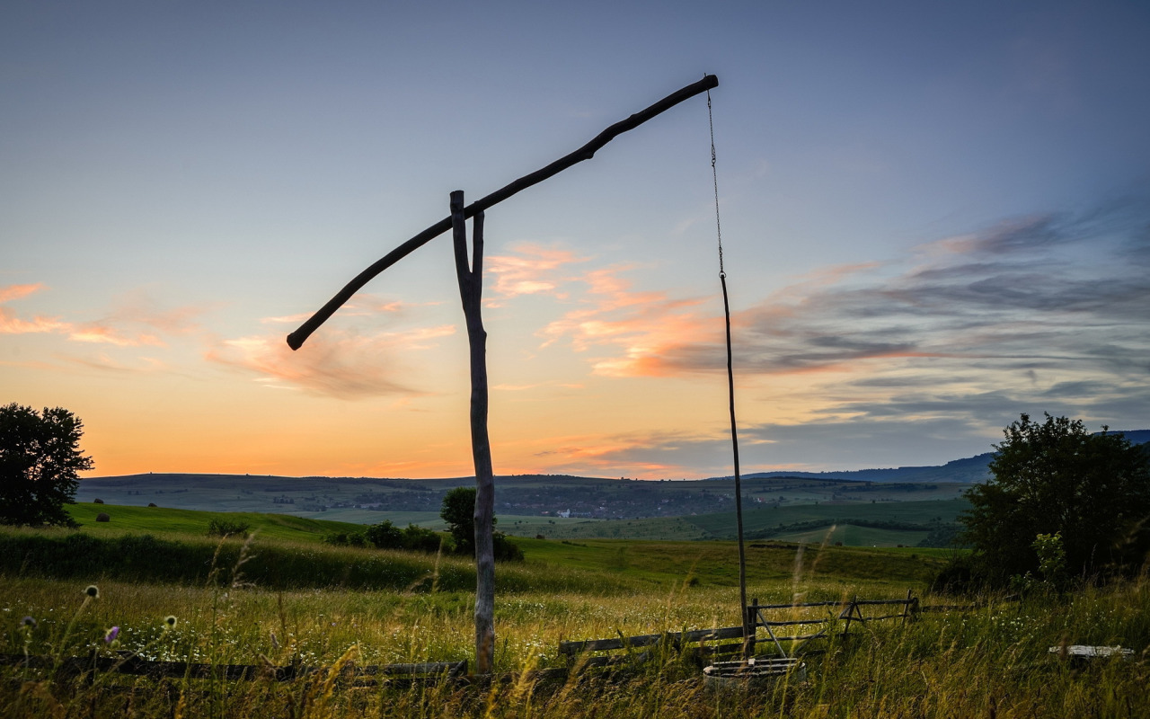 поле, утро, колодец