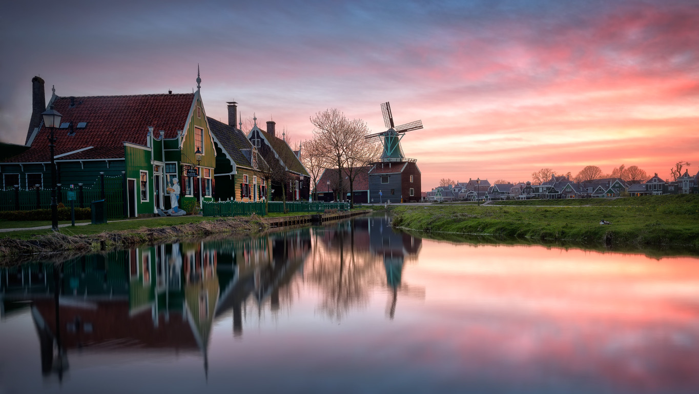 Назад к обои закат, отражение, дома, мельница, Нидерланды
