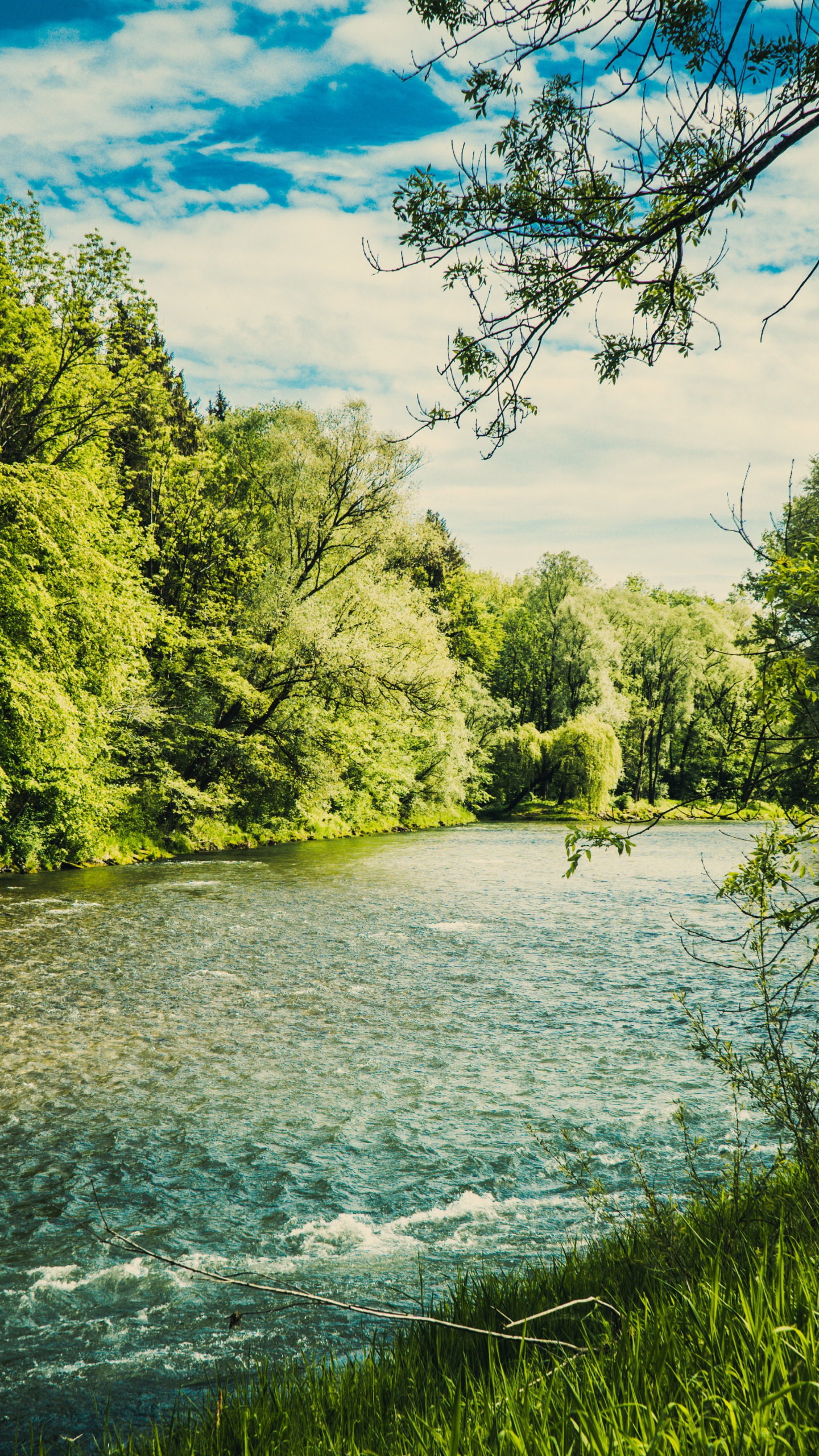 Назад к обои лес, небо, трава, облака, река