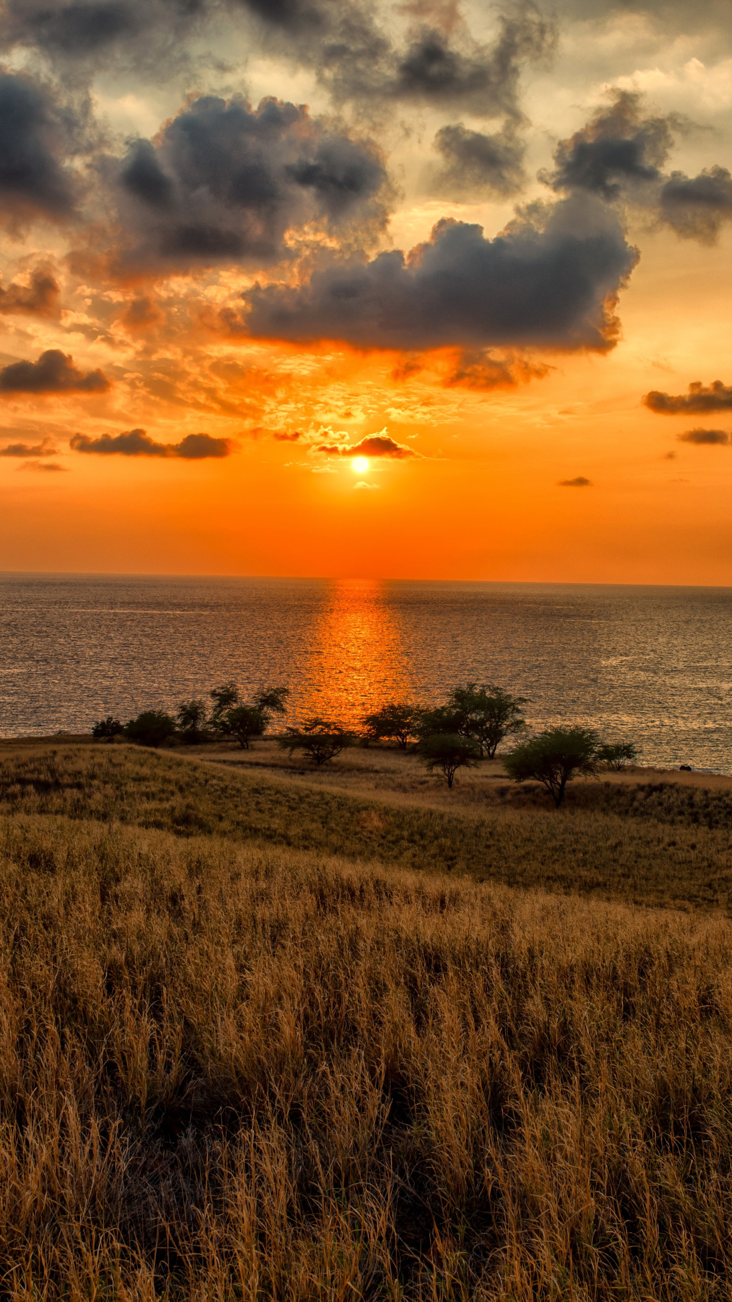море, небо, трава, солнце, облака, закат, побережье, горизонт