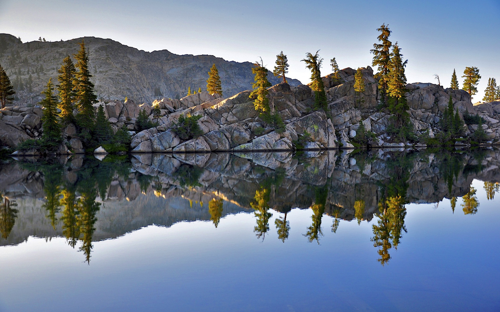 Назад к обои небо, облака, деревья, горы, озеро, отражение, река, скалы