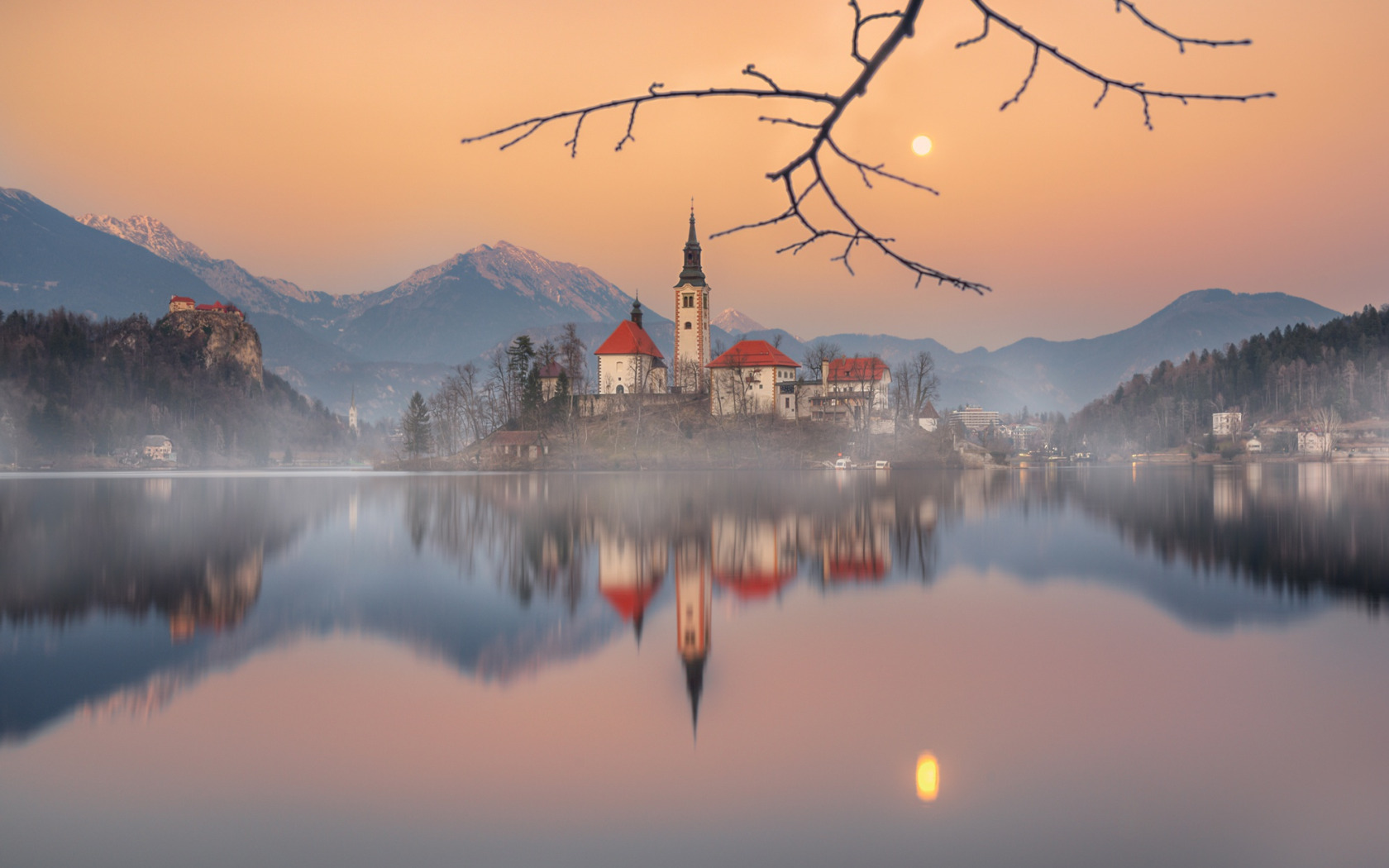 Назад к обои горы, ветки, озеро, отражение, остров, Словения, Lake Bled, Slovenia