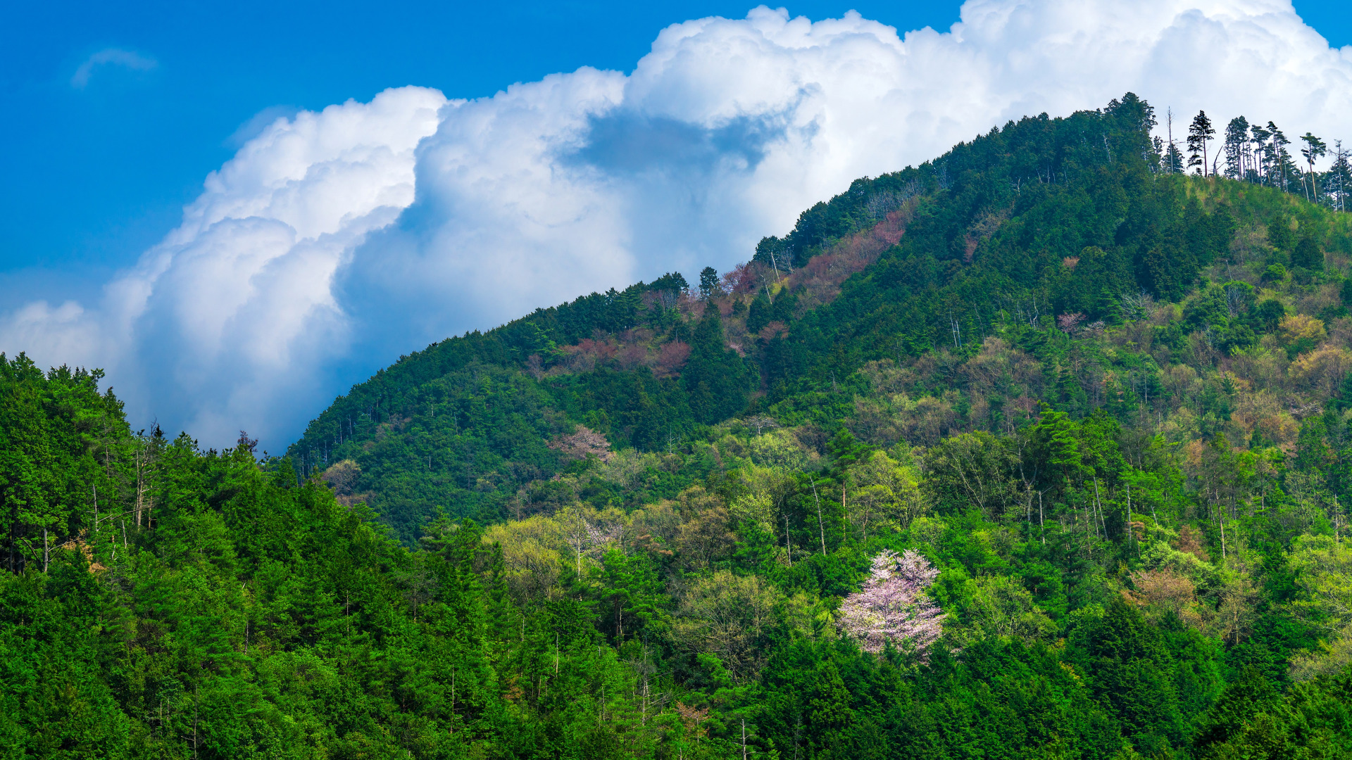 зелень, лес, небо, солнце, облака, деревья, горы, Япония