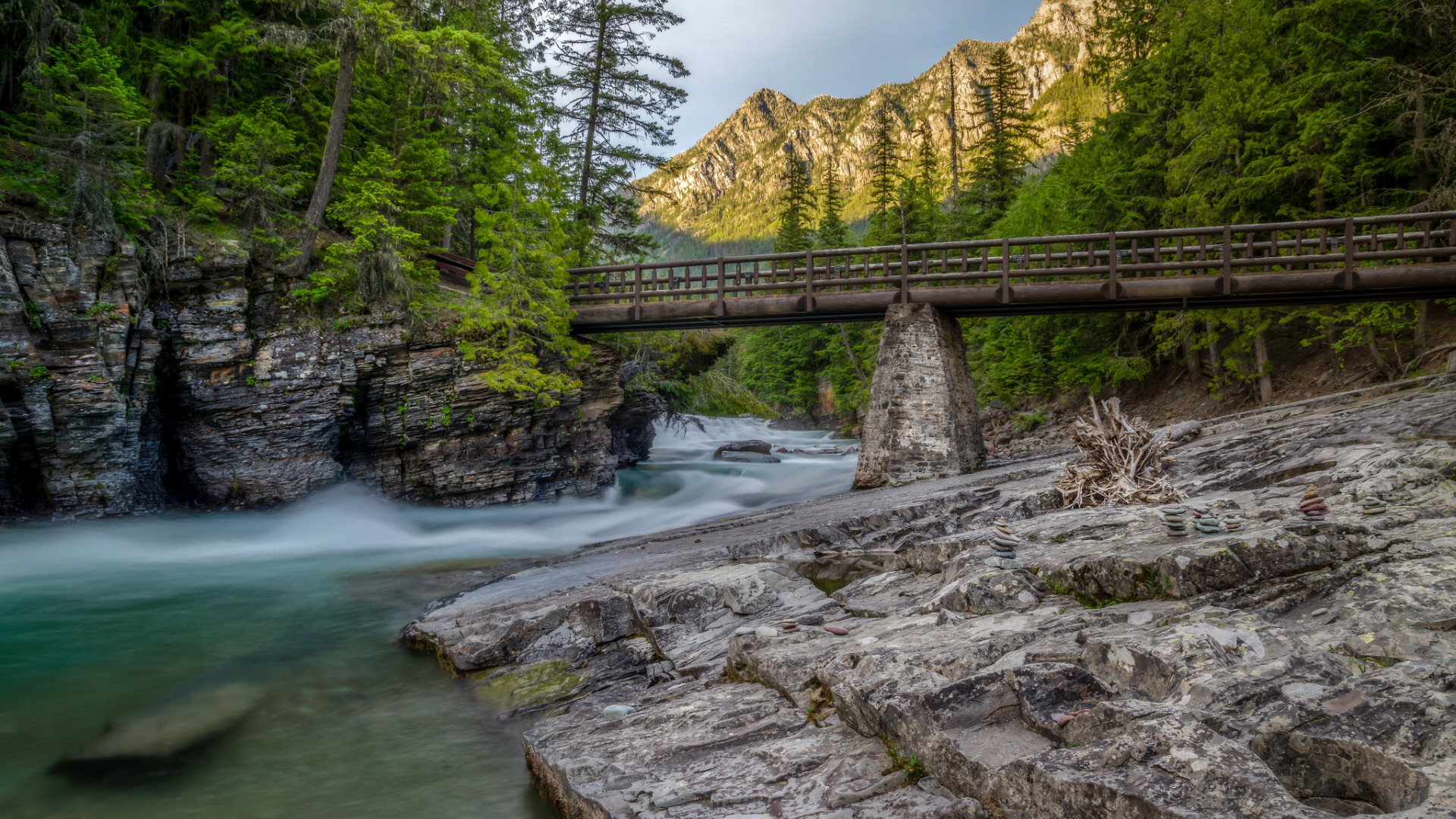 Назад к обои деревья, горы, мост, река, ручей, Монтана, Glacier National Park, Скалистые горы