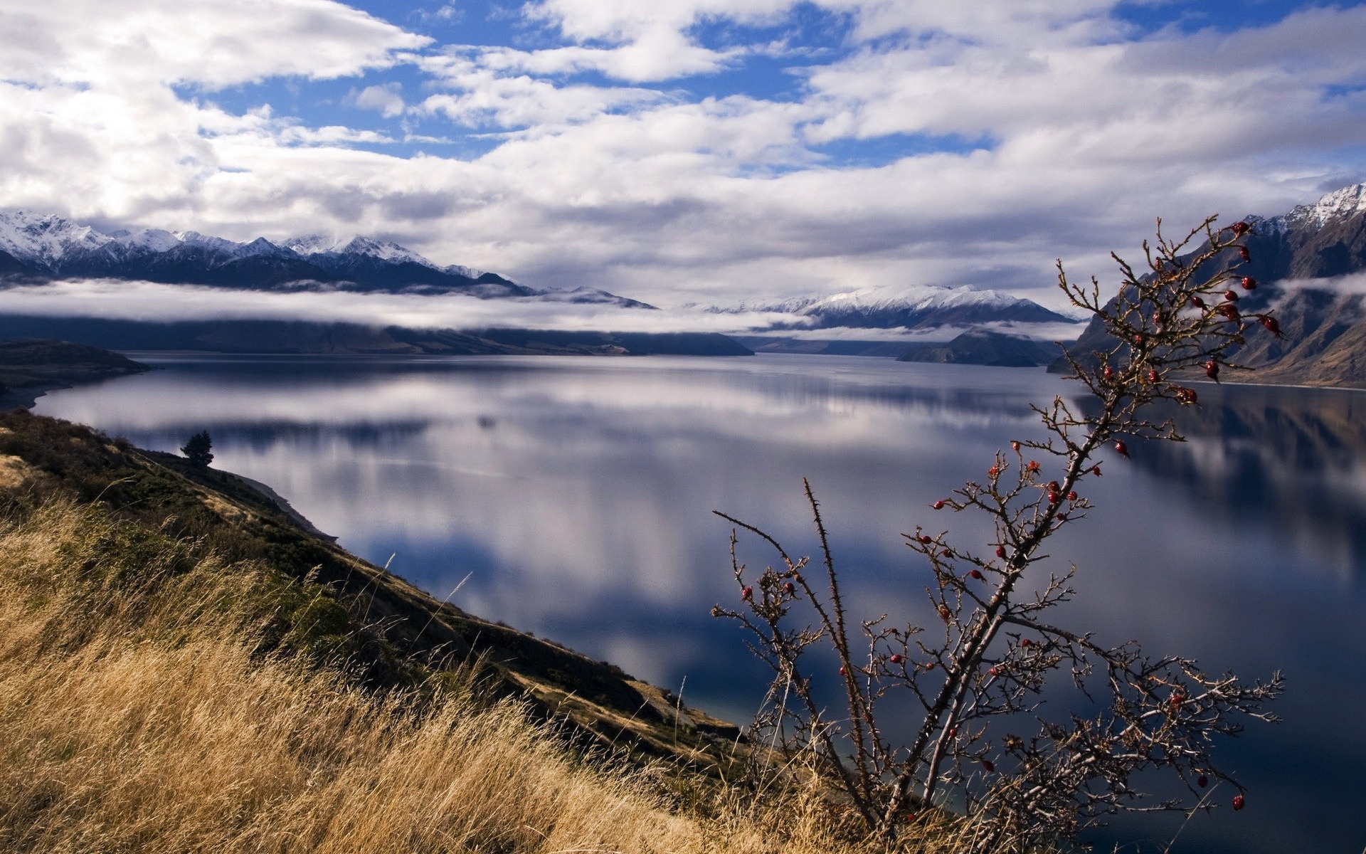 Назад к обои небо, трава, вода, облака, горы, озеро, гладь, берег