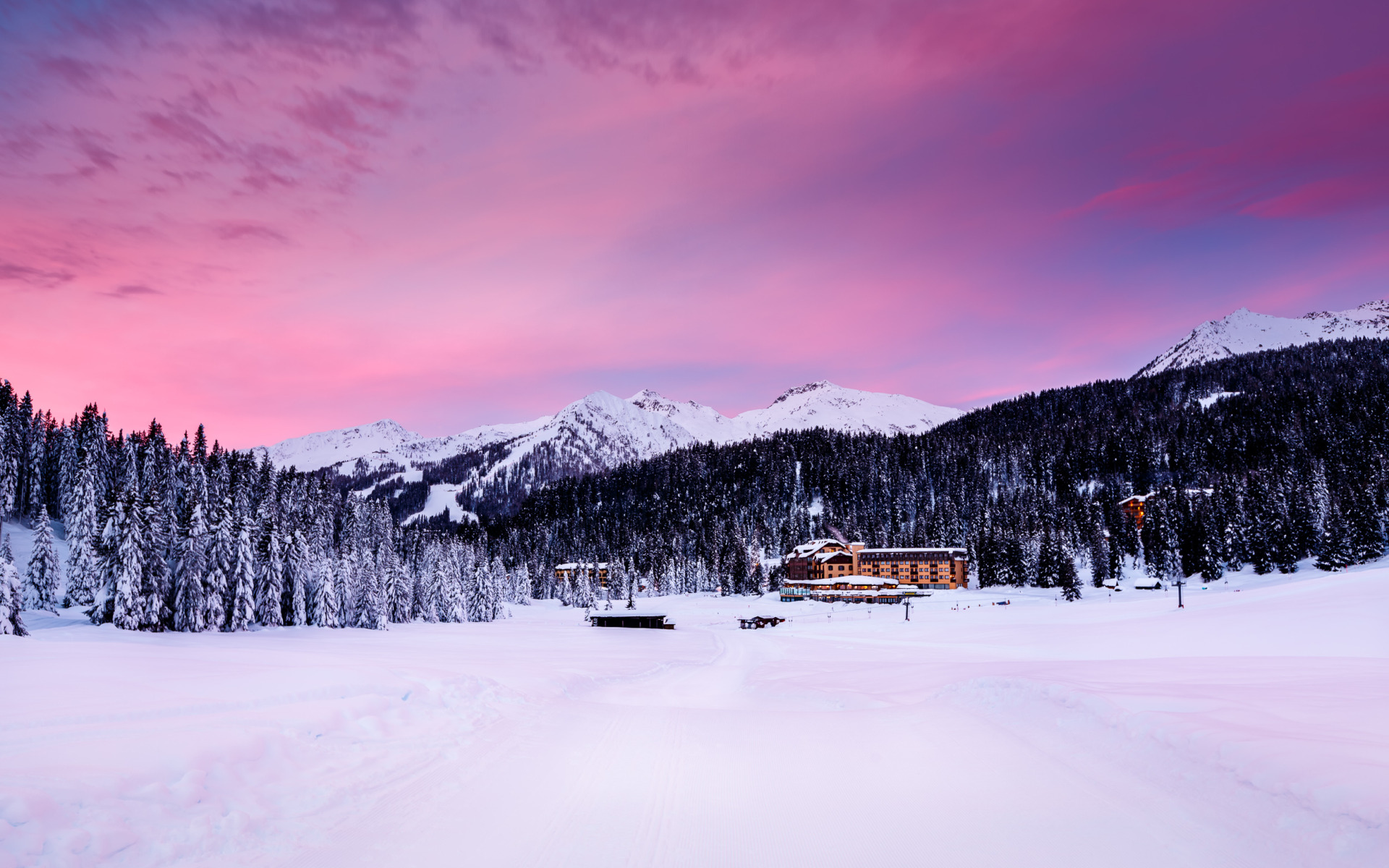 снег, деревья, горы, природа, здания, елка, дома, вечер