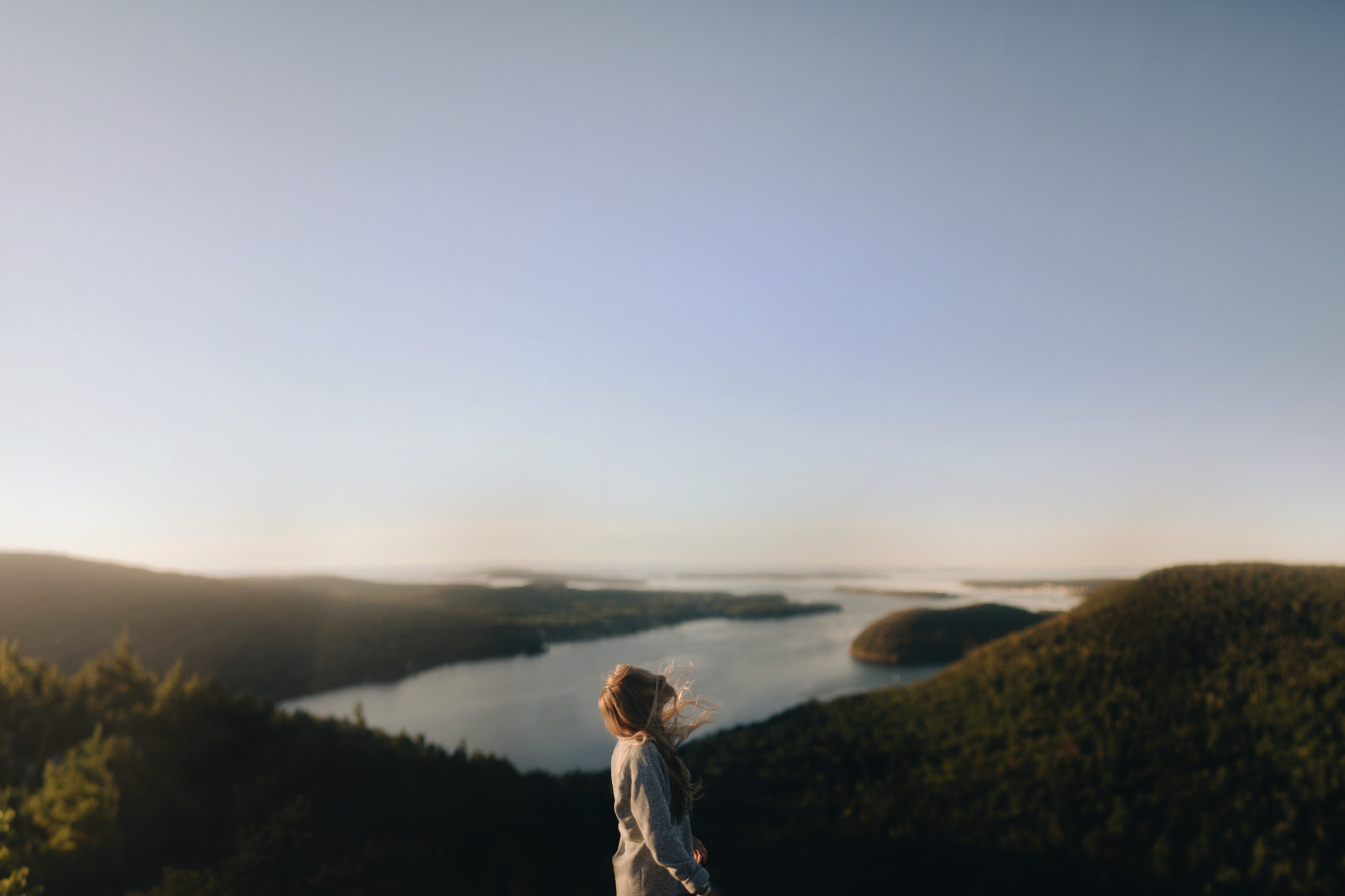 море, небо, девушка, океан, ветер, холмы, горизонт, блондинка