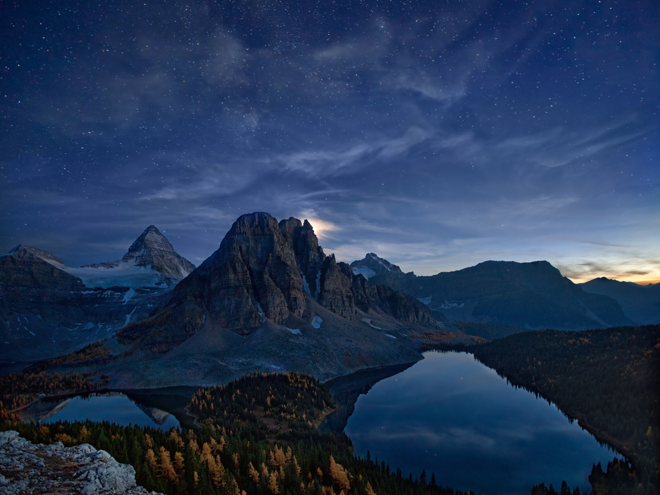 осень, небо, звезды, горы, ночь, озеро, скалы, Канада
