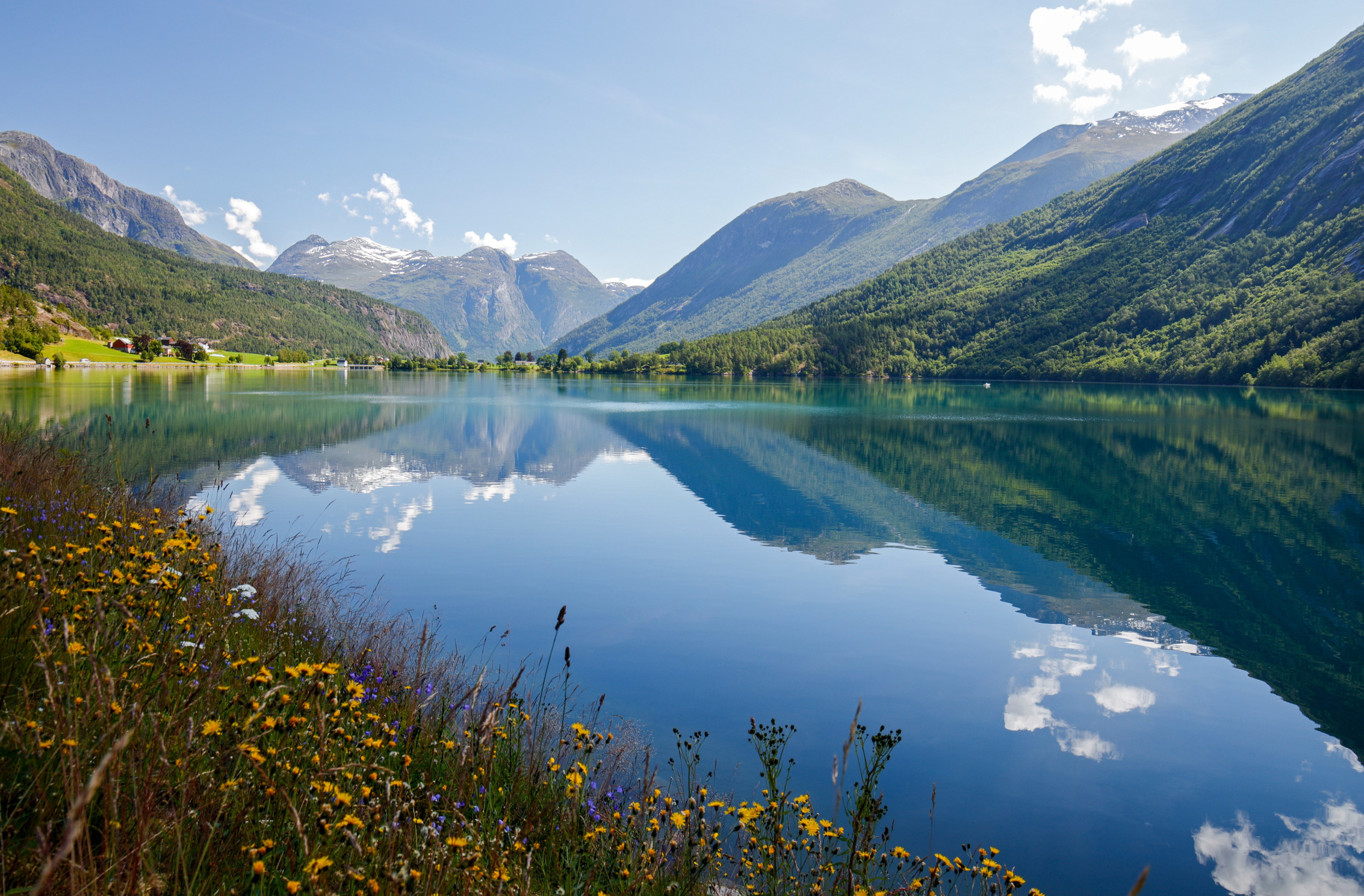 лето, небо, облака, горы, озеро, отражение, спокойствие, Норвегия