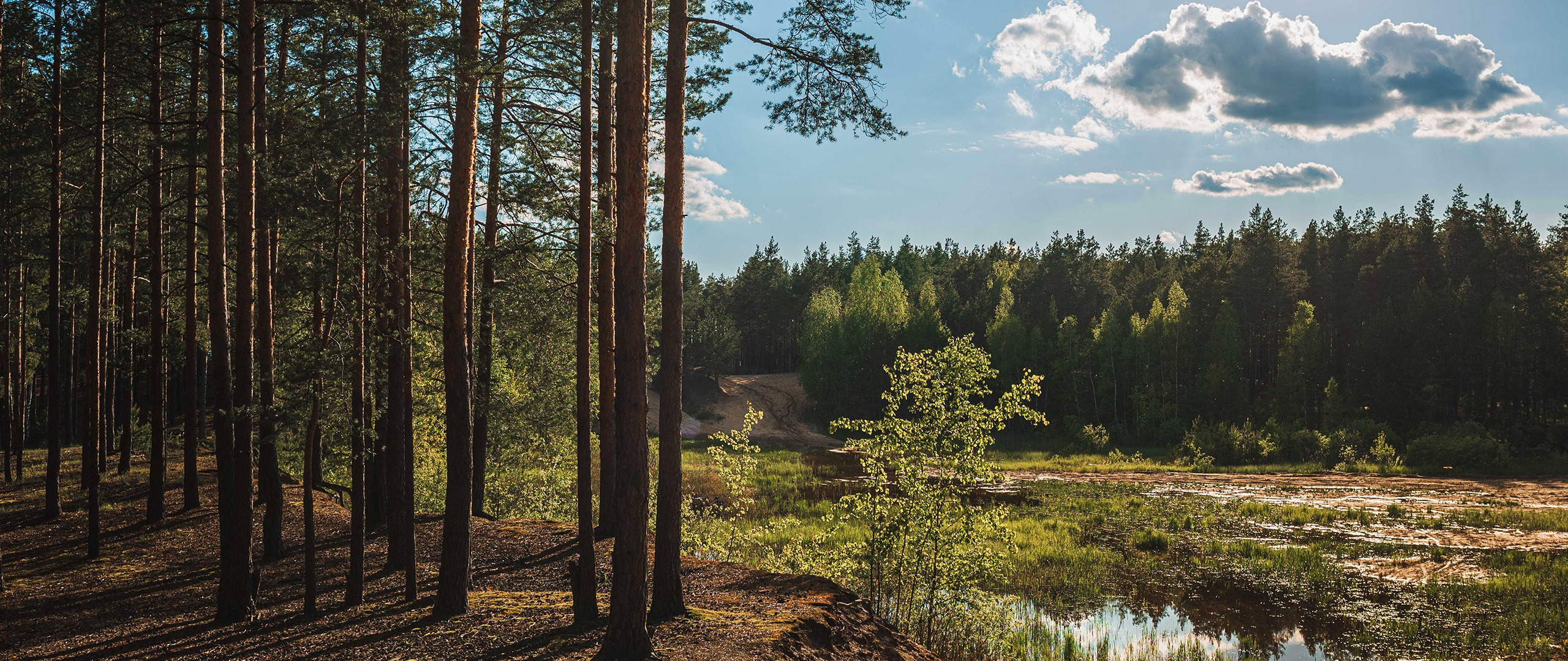 лес, небо, солнце, деревья, река, тень, шишки, Васильев Владимир