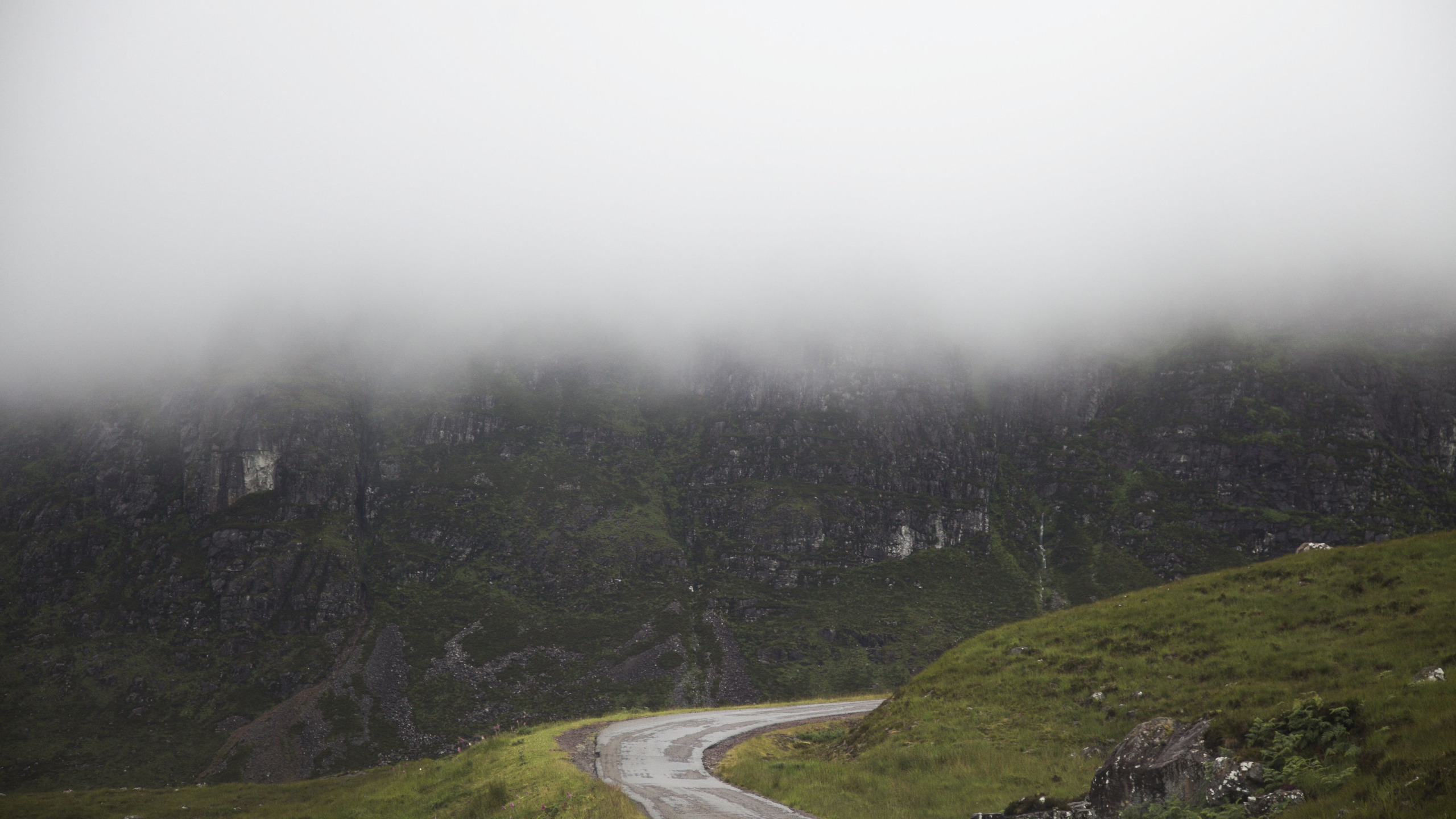 road, clouds, mountain, cliff