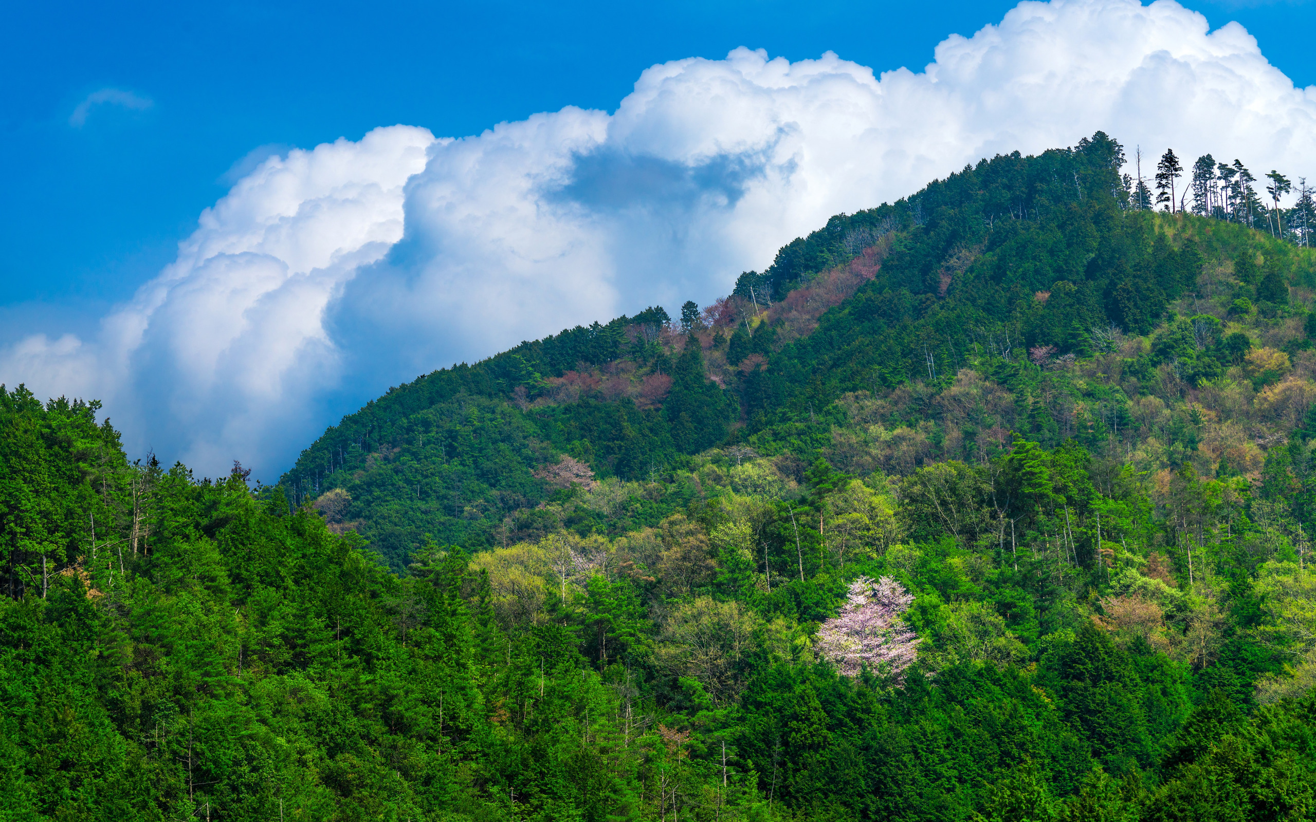 зелень, лес, небо, солнце, облака, деревья, горы, Япония