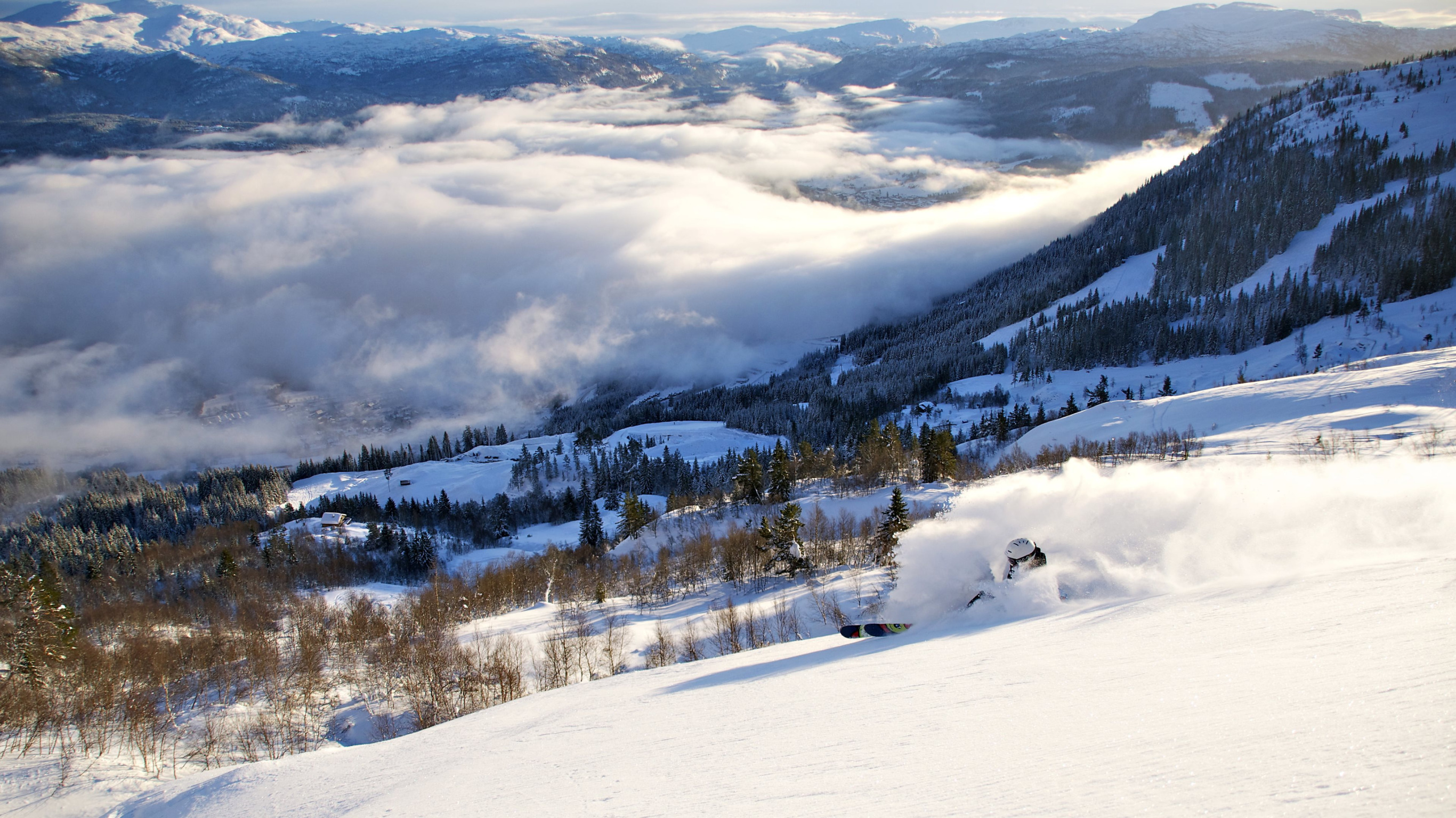Назад к обои зима, снег, горы, туман, спуск, Норвегия, лыжник, горнолыжный курорт Восс