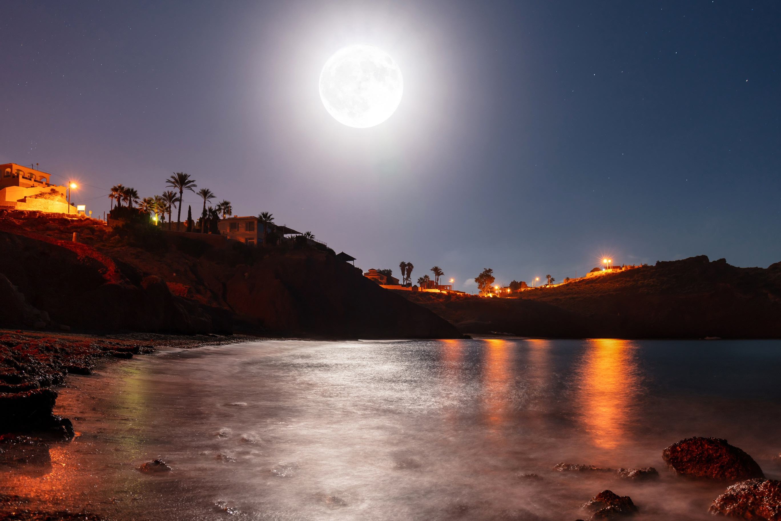 небо, звезды, ночь, огни, камни, пальмы, скалы, луна