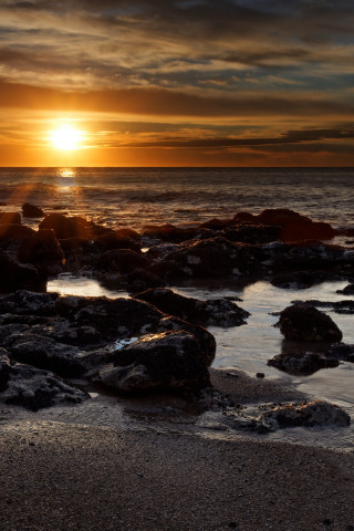 Назад к обои море, пляж, небо, солнце, чёрные камни