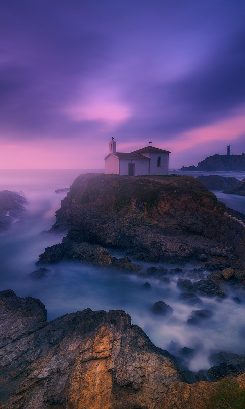 Назад к обои море, фиолетовый, небо, закат, туман, камни, скалы, берег