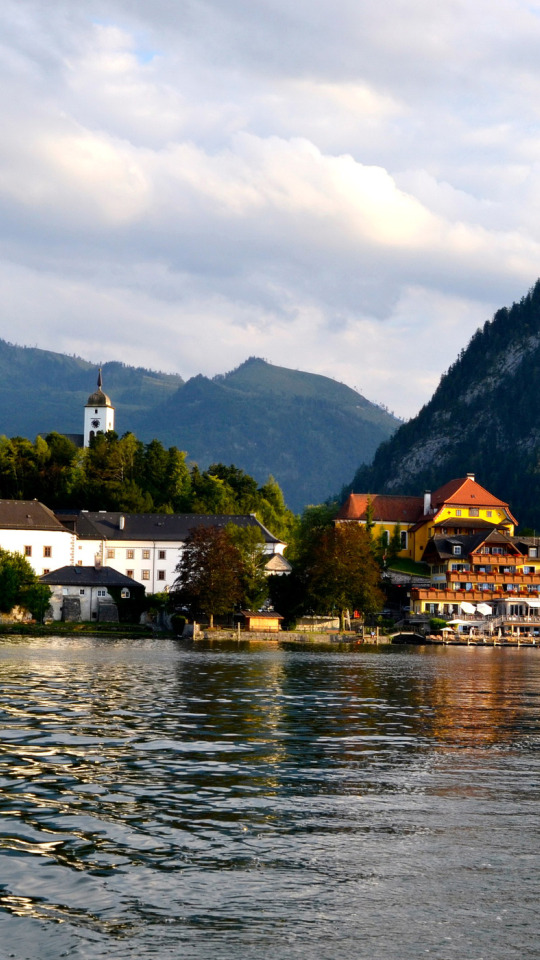 Назад к обои деревья, горы, озеро, скалы, берег, дома, Австрия, Salzkammergut
