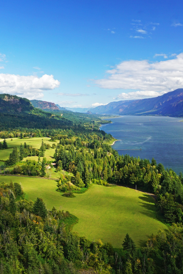 зелень, лес, небо, солнце, облака, деревья, горы, река