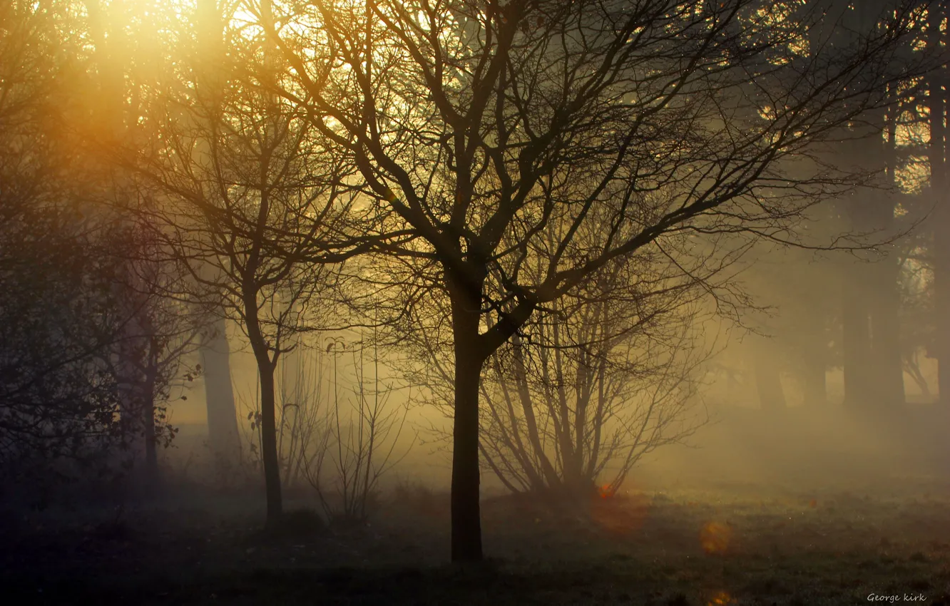 Лучи, деревья, туман, сумрак, georg kirk обои на телефон (фото, картинки)