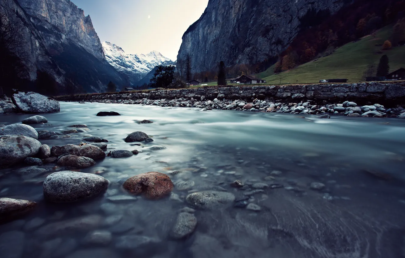 Горы, река, швейцария, домик, switzerland, lauterbrunnen, лаутербруннен обои на телефон (фото, картинки)