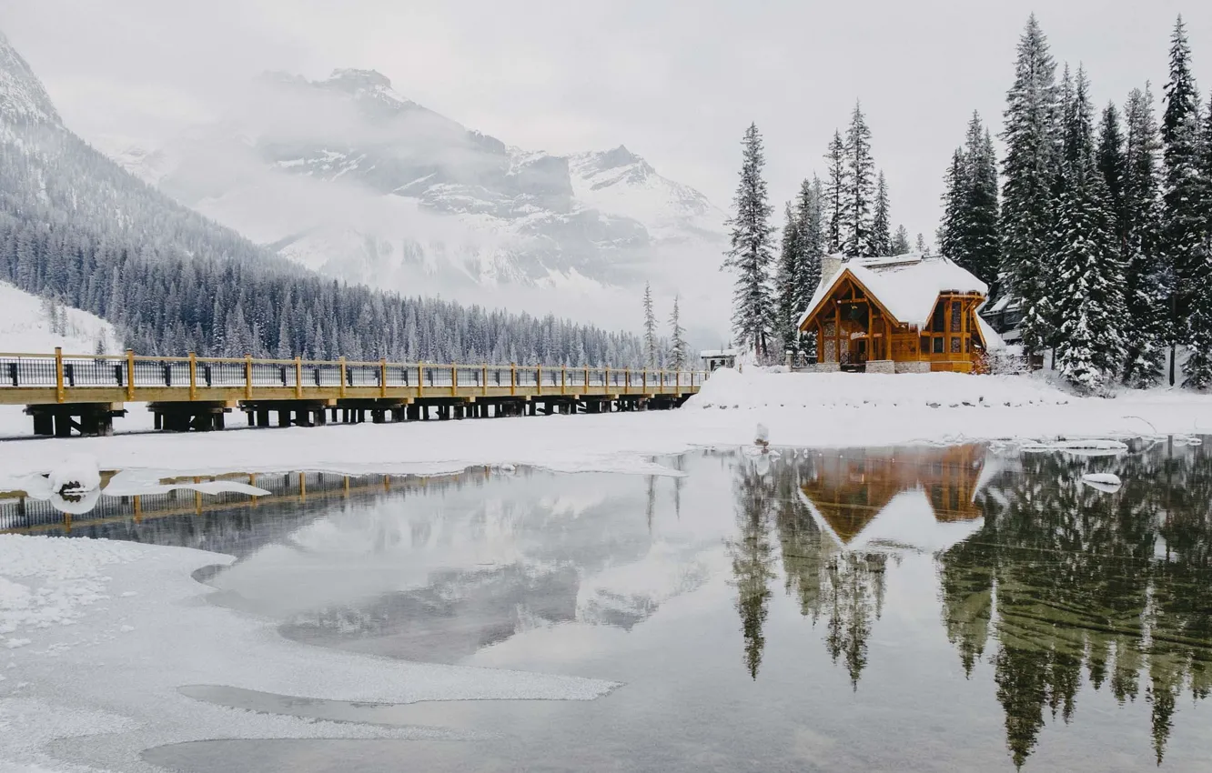 Зима, лес, снег, горы, домик, мостик обои на телефон (фото, картинки)