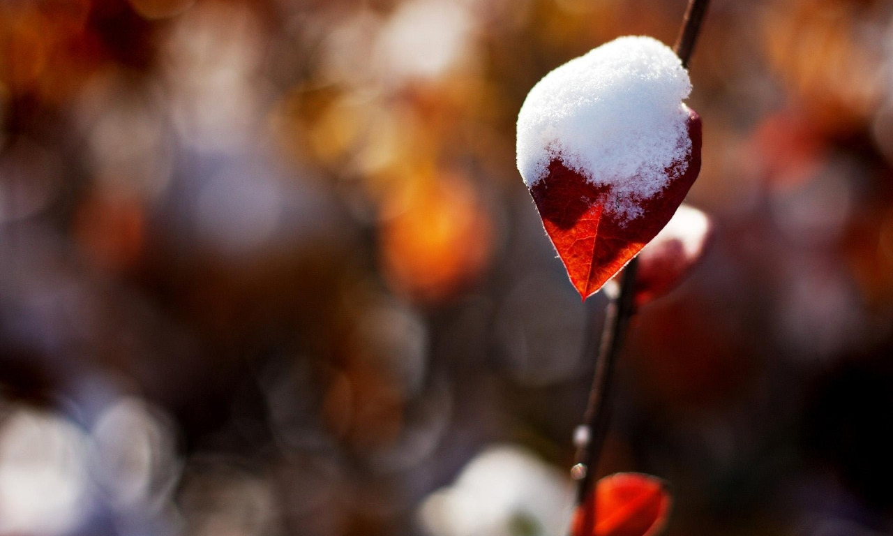 Назад к обои красный, блики, веточка, листик, одинокий, Под снегом