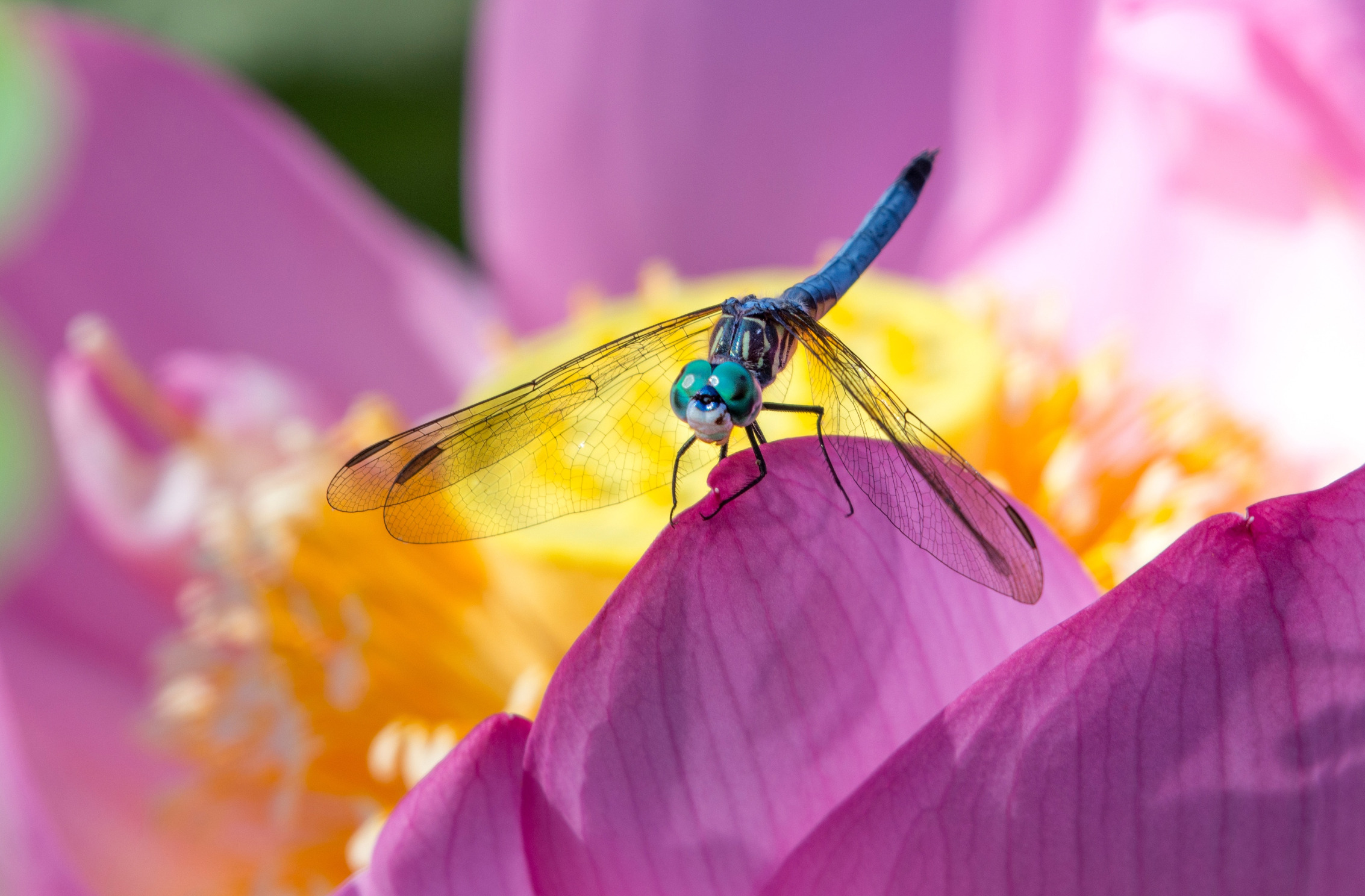 макро, цветы, размытие, стрекоза, лепестки, лотос, насекомое, розовые