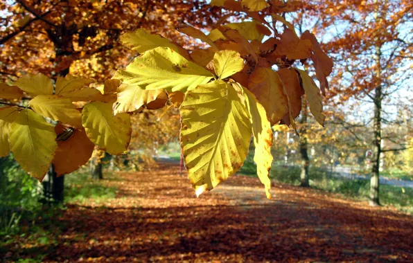 Дорога, осень, асфальт, листья, макро, желтый, природа, размытость обои на телефон (фото, картинки)