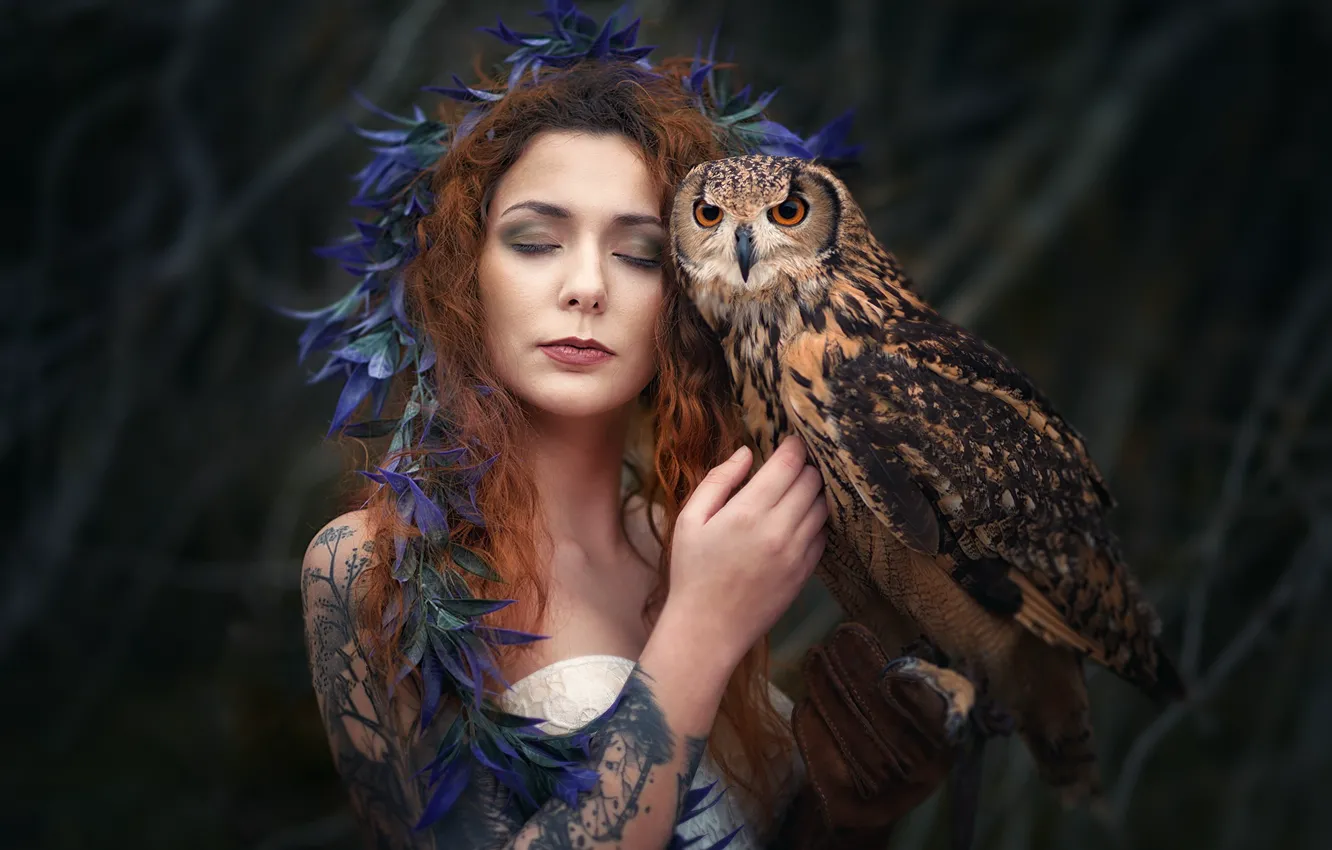 Девушка, сова, портрет обои на телефон (фото, картинки)