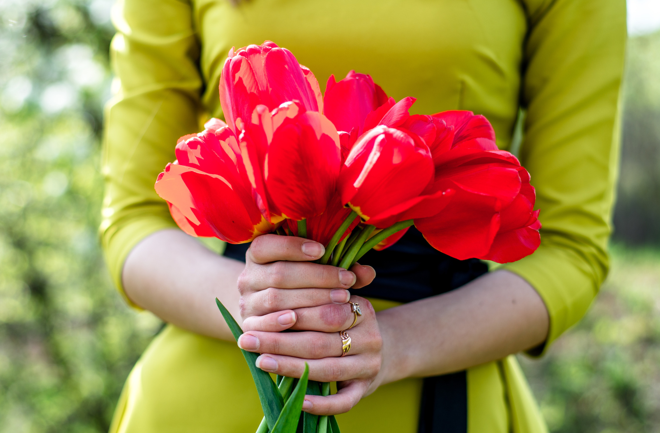 девушка, цветы, весна, руки, тюльпаны, пояс, бант, детали