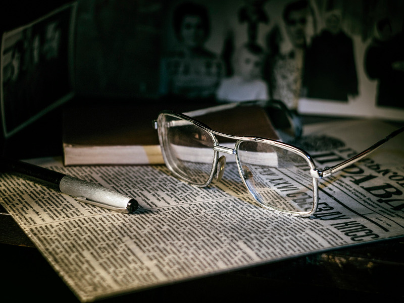 стиль, ретро, прошлое, очки, ручка, газета, книга, фотографии