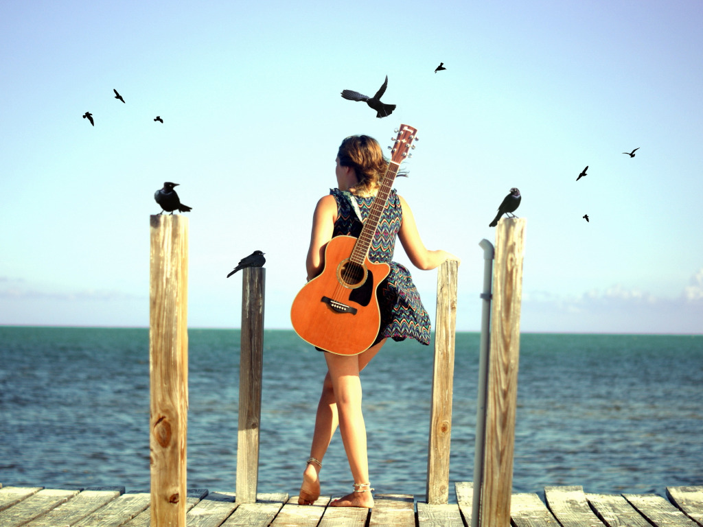 Назад к обои море, девушка, настроение, птица, гитара